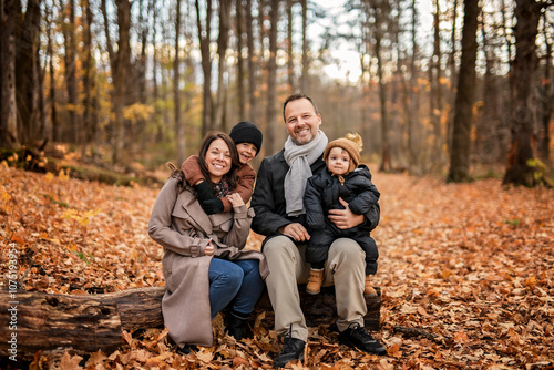 Joyful family and childs having fun, laugh and enjoy nature outdoors at autumn park.