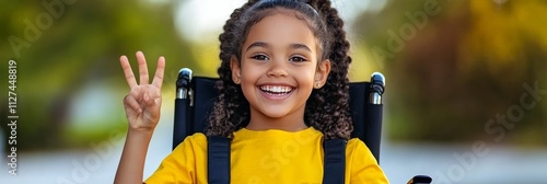 girl, wheelchair, smiling, happy, children, african, american, young, positive, outdoors, nature, three, finger, peace, signs, strength, ability, confident, joyful, cheerful, bright, sunshine, healthy, vibrant, energetic, optimistic, courageous, resilient, determined, freedom, independence, mobility, accessibility, inclusion, diversity, representation, empowerment, hope, dream, future, success, potential, possibility, life, living, person, children, youth