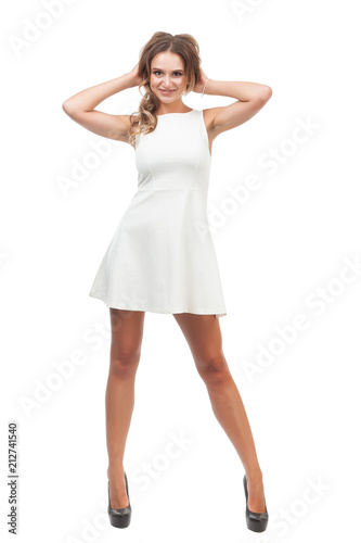 dress, white, woman, girl, isolated, beautiful, fashion, young, model, female, lady, attractive, beauty, background, leg, elegant, glamour, sexy, party, studio, portrait, caucasian, pretty, posing, elegance, hair, long, body, sensual, happy, blond, adult