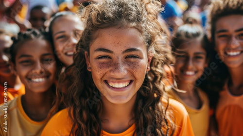 smiling, girl, friends, happiness, curly hair, group, joy, friendship, cheerful, youth, togetherness, community, diverse, happy, gathering, social, fun, bonding, positive, children, summer, freckled, crowd, team, oneness, portrait, smiling girl, school, children, young, playful, closeup, camaraderie, excited, celebration, teenage, teamwork, group picture