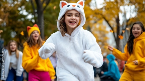 children, celebrate, autumn, animal, costume, joyful, park, dancing, falling, leaf, happy, fun, playful, outdoors, seasonal, festive, costume, event, smiling, tree, laughter, friends, party, vibrant, youthful, energetic, group, cheerful, nature, foliage, excitement, togetherness, happiness, festivity, enjoyment, physical activity
