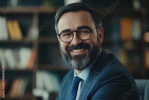 Joyful Male Lawyer in Modern Office Setting - Close-Up Portrait with Grey Accents