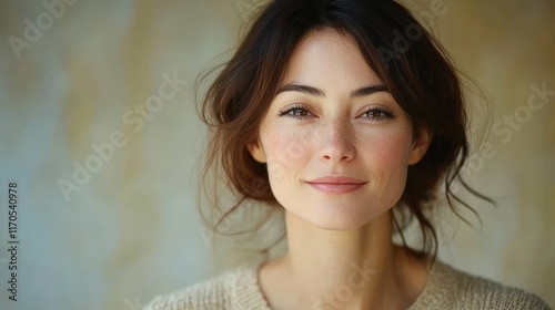 Joyful Middle-Aged Woman Smiling Indoor Beauty Portrait with Natural Light Skincare and Make-Up
