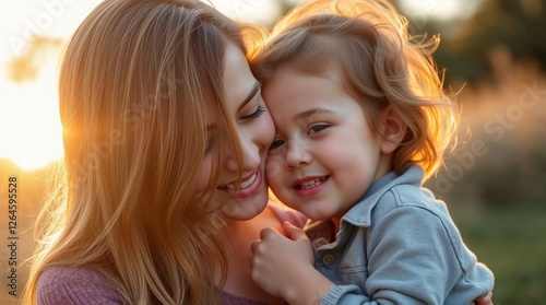 Joyful mother and her smiling little son embracing together during sunset in a warm outdoor setting
