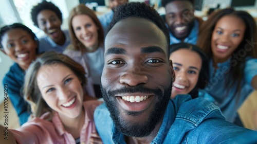 Joyful selfie featuring professionals in an office setting, highlighting community support, diversity, and teamwork among colleagues