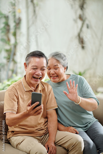Joyful senior couple video calling their grandchildren or friends