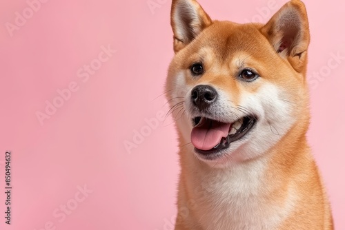 Joyful shiba inu dog smiling on pastel background with ample room for text placement