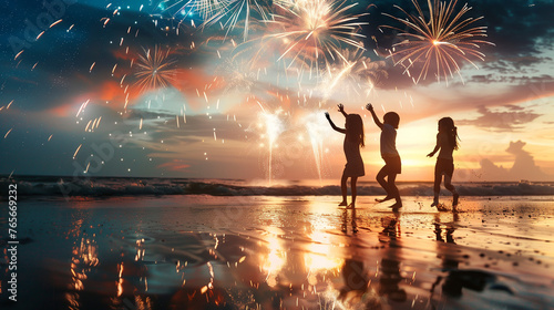 children, beach, sunset, fireworks, silhouette, playing, joyful, celebration, ocean, seacoast, twilight, sparkling, colourful, festive, new year, holiday, friends, fun, happiness, water, dusk, sky, light, bright, party, vibrant, coast, vacation, summer, freedom, leisure, youth, childhood, festivity, energy, exciting, golden hour, evening, playful, family, memory, gathering