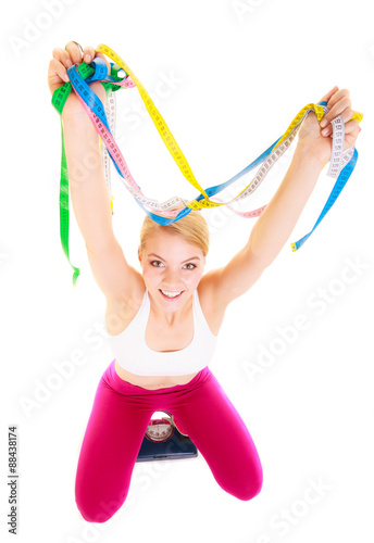 woman, happy, joyful, slimming, diet, weighing, measuring, tape, weight, loss, girl, health, care, healthy, scale, lifestyle, dieting, measure, slim, thin, fitness, fit, lose, calorie, white, isolated