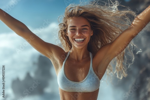 woman, ocean, cliff, celebration, happiness, sunny, joyful, nature, beauty, summer, adventure, carefree, flowing, hair, scenery, landscape, smile, sunlight, fitness, freedom, travel, excitement, wave, sea, horizon, energy, fun, fashion, summer, morning, beach, positive, vibe, spirit, young, adult, health, lifestyle, scenic, view, vibrant, bliss, cheerful, marin