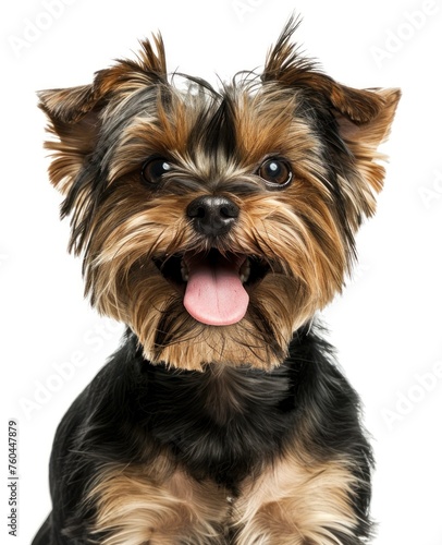 yorkshire terrier, dog, pet, canino, animal, cute, furry, happy, companion, portrait, cheerful, energetic, playful, friendly, affectionate, joyful, adorable, grooming, fluffy, lively, pedigree, purebred, alert, attentive, little dog, miniature, terrier, expression, excitement, tongue, nose, ear, teeth, whisker, mammal, indoor, studio shot, closeup, isolated on white, generative, ai