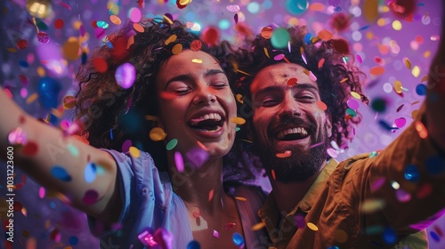 couple, celebration, young, joy, happiness, confetti, party, fun, affection, excitement, smiling, colourful, together, love, festive, playful, energy, friends, portrait, laughter, emotion, cheerful, vibrant, event, enjoyment, moment, hair, bright, atmosphere, carefree, human relationships, dance, thrill, sharing, warmth, bliss, smile, artistic, indoor, social, lively, joyfulness, expression