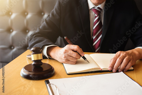 Judge gavel with Justice lawyers, Businessman in suit or lawyer working on a documents. Legal law, advice and justice concept