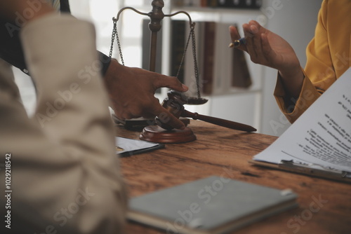 Judge gavel with Justice lawyers having team meeting at law firm background. Concepts of Law and Legal services.