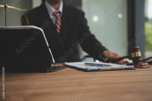 Judge gavel with Justice lawyers having team meeting at law firm background. Concepts of Law and Legal services.