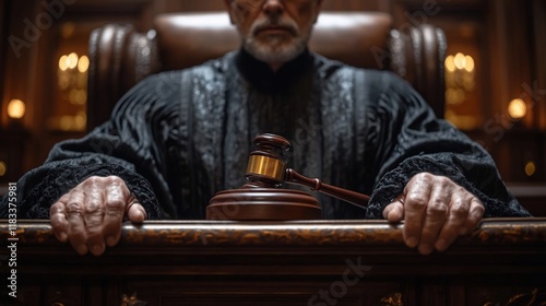 Judge in Courtroom, Gavel on Bench, Justice and Law