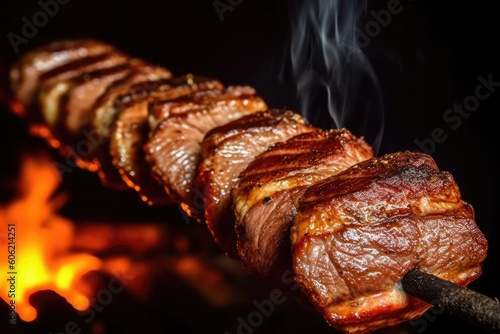 Juicy Angus steak or sirloin steak grilled over hot coals, sliced rare on a wooden board. Generative AI.