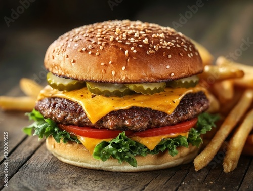 Juicy cheeseburger with lettuce, tomato, pickles, and french fries on rustic wood.