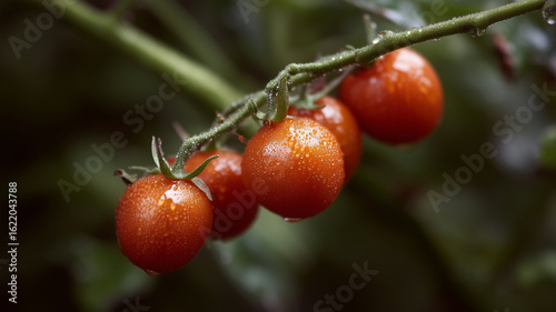 Juicy cherry tomato on vine with water droplets, fresh organic vegetable in garden, vibrant and healthy