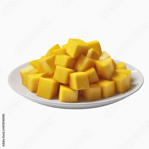 mango, tropical fruit, fruit salad, dessert, health food, vitamin c, summer fruit, exotic fruit, sweet, yellow, juicy, delicious, food photography, white plate, studio shot, closeup, hi-res, vibrant, colourful, appetising, ingredient, receipe, snack, healthy eating, tropical