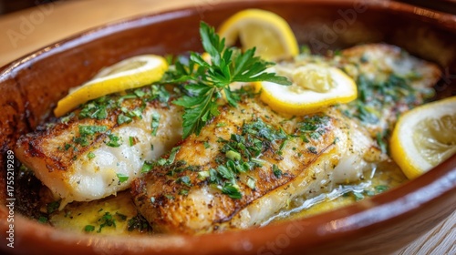Juicy fish fillets topped with fresh herbs and lemon slices ready to be enjoyed at dinner.
