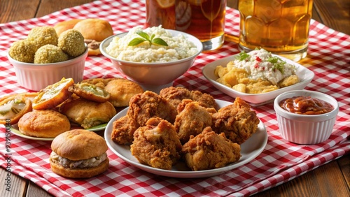 Juicy fried chicken, crispy hushpuppies, and creamy coleslaw sit atop a red-checked tablecloth, surrounded by sweet iced tea and warm buttermilk biscuits.