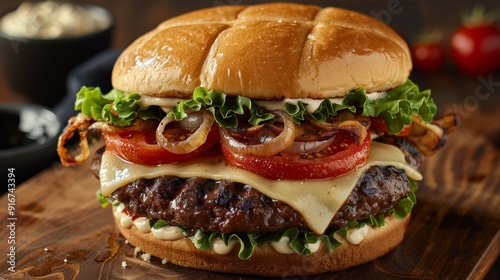 Juicy gourmet hamburger with fresh ingredients served on a wooden table