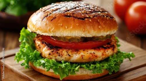 Juicy Grilled Chicken Burger with Fresh Lettuce and Tomato Slices