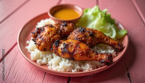 Juicy grilled chicken inasal served with fluffy white rice, side of fresh lettuce. Filipino dish features marinated poultry with smoky, charred exterior, offering delicious, protein-rich meal for