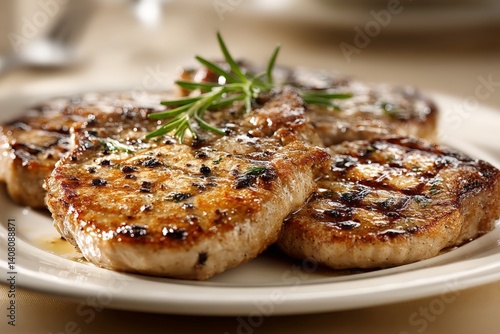 Juicy grilled pork chops garnished with fresh herbs served on a white plate at a cozy restaurant setting