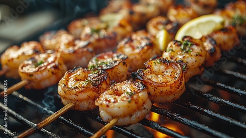 shrimp, grilled, skewer, bar-b-q, lemon, cooking, seafood, heat, fire, herb, juicy, spice, tender, delicious, meal, summer, food, epicure, healthy, appetising, feast, receipe, charred, cookery, savoury, sizzle, bar-b-q, fresh, bite, platter, catering, picnic, party, backyard, tasty, garnishing, chef, eatery, presentation, brine, natural, texture, indulgence, gathering, deliciously