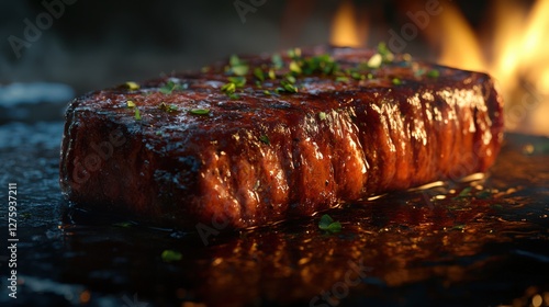 Juicy grilled steak garnished with herbs sizzling on a hot stone with flames in the background