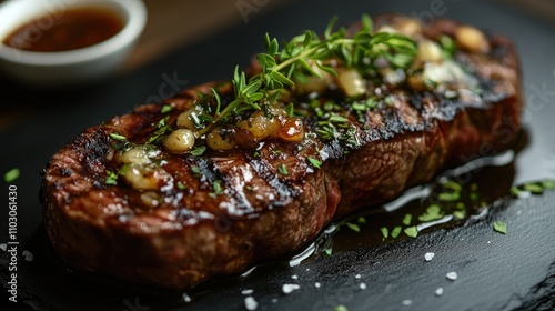 juicy, grilled, steak, rich, sauce, fresh, herb, attractively, arranged, sleek, black, plate, sophisticated, dining, life events, epicure, culinary, presentation, savoury, no people