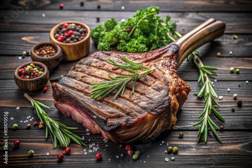 Juicy grilled tomahawk steak sits atop a black wooden surface, glistening with savory juices, surrounded by fresh herbs, with ample copy space for text or graphics.