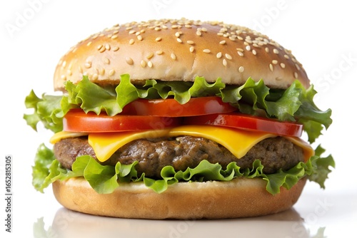 Juicy hamburger with lettuce, tomato, cheese, and beef patty, isolated on white background