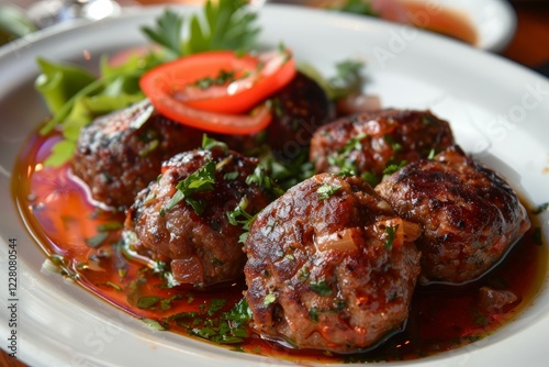 Juicy meatballs simmering in rich sauce, garnished with fresh parsley and tomato slices, presented on an elegant white plate
