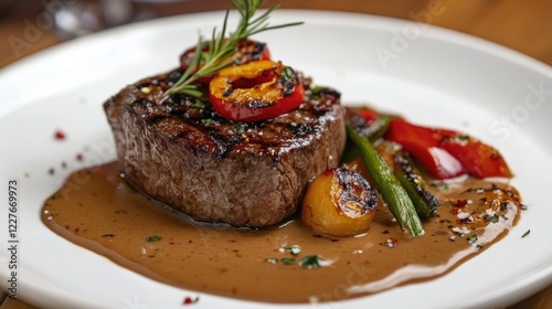 Juicy Medium Rare Grilled Beef Steak with Pepper Sauce and Colorful Grilled Vegetables on a Plate
