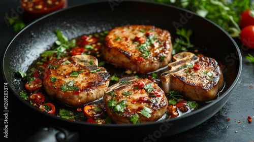 Juicy pork chops searing in a flavorful marinade with herbs and spices.