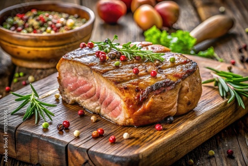Juicy Pork Steak, Wood Board, Gourmet Food Photography, High Depth of Field, Delicious Recipe