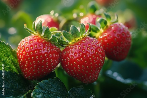 Juicy red strawberries growing in a lush garden setting during the early morning light