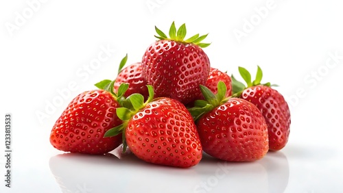 Juicy red strawberries with fresh green leaves, isolated on a white background, ideal for healthy eating concepts, food photography, diet promotions, organic branding, and grocery advertisements