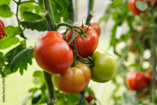 Juicy red tomatoes ripening on the vine in a greenhouse. Fresh, organic produce.