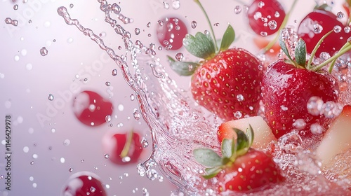 Juicy strawberries and cherries splashing in liquid, frozen in motion with vibrant color imagine food photography,
