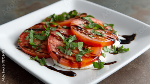 Juicy tomato slices fresh mozzarella basil leaves balsamic glaze caprese salad white plate healthy appetizer Italian cuisine vibrant delicious