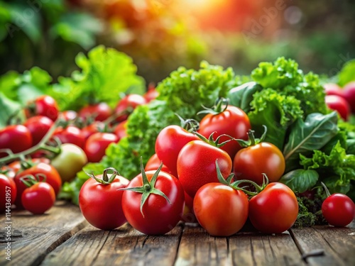 Juicy Tomatoes & Fresh Greens: Bokeh Photography, Wooden Table, Food Photography, Still Life