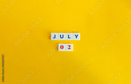 July 02 Banner. Concept of Celebrating Anniversary, Birthday, Jubilee, Big Day. Text on Block Letter Tiles and Icon on Flat Background. Minimalist Aesthetics.