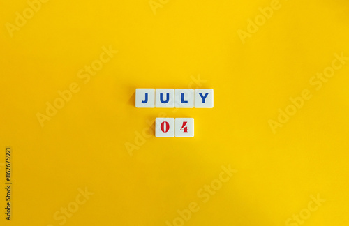 July 04 Banner. Concept of Celebrating Anniversary, Birthday, Jubilee, Big Day. Text on Block Letter Tiles and Icon on Flat Background. Minimalist Aesthetics.