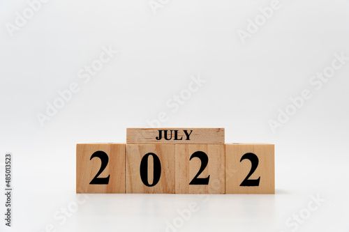 July 2022 written on wooden blocks isolated on white background with copy space