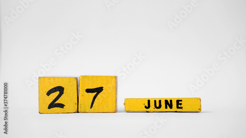JUNE 27 Wooden calendar. Micro Enterprises Day. White background with space for your text