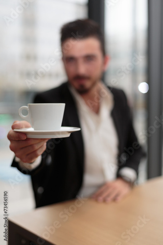 Junger Geschäftsmann reicht Kaffeetasse Hochformat